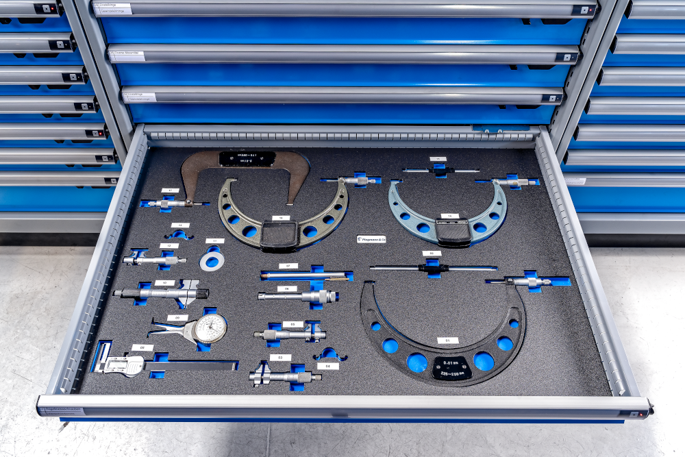 - Verschiedene Einteilungsmaterialien von Trennblech über Kunststoffmulden bis hin zu Hartschaumeinlagen und Schubladenschließungsmöglichkeiten