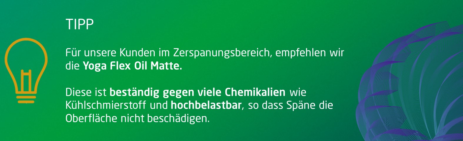- Rutschfestigkeit und Sicherheit: Reduzierung des Sturzrisikos in Arbeitsumgebungen mit glatten Böden. Dies ist besonders wichtig in Bereichen, in denen Flüssigkeiten wie z.B. Kühlschmierstoff verschüttet werden können oder sich Ölnebel auf den Boden absetzen kann.
