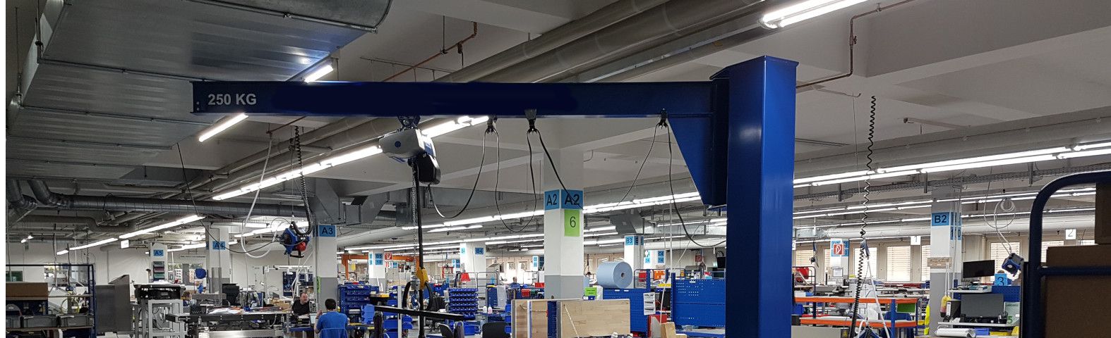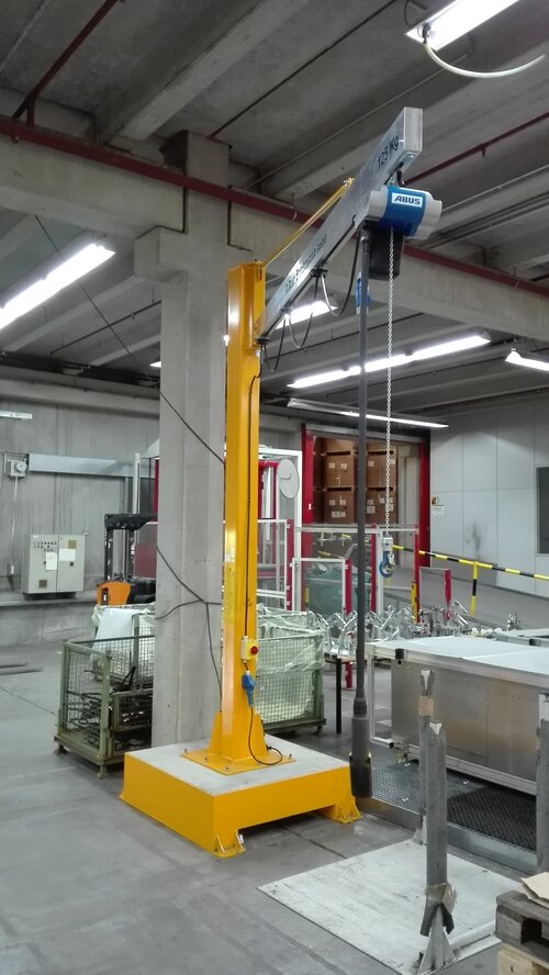 Kompakte Bauweise statt fest verbautem Kran. Ideal für beengte Produktionsflächen mit häufig wechselnden Anforderungen.